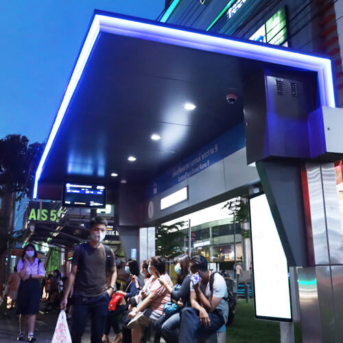 Plan B Media, incorporate with the Bangkok Traffic Management Department, has improved bus shelters in Bangkok according to the concept of a smart city. The shelters now include the following facilities: LED screens that display the arrival times of buses, CCTV cameras, USB ports for charging mobile devices, and free WiFi. These facilities are designed to meet the needs of modern lifestyles and help people to manage their time and plan their travel more effectively.
