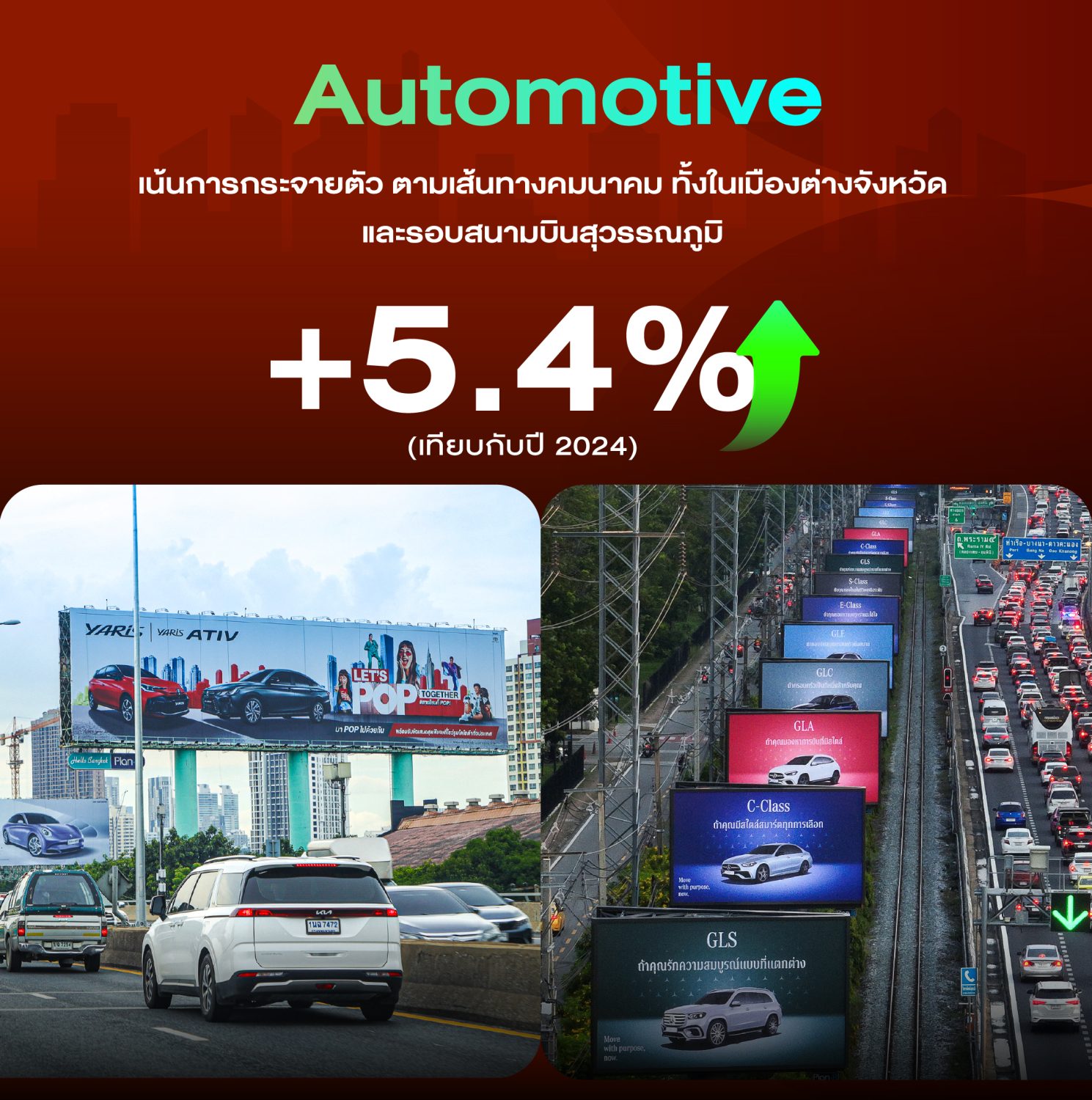 1. Automotive (ยานยนต์) 🚗⚡ กลุ่มนี้เน้นการใช้งบ OOH ผ่านสื่อ Digital และ Classic เป็นสัดส่วนหลัก โดยกระจายตัวไปตามเส้นทางการเดินทางทั้งในเมือง, ต่างจังหวัด รวมถึงพื้นที่รอบสนามบินสุวรรณภูมิ
