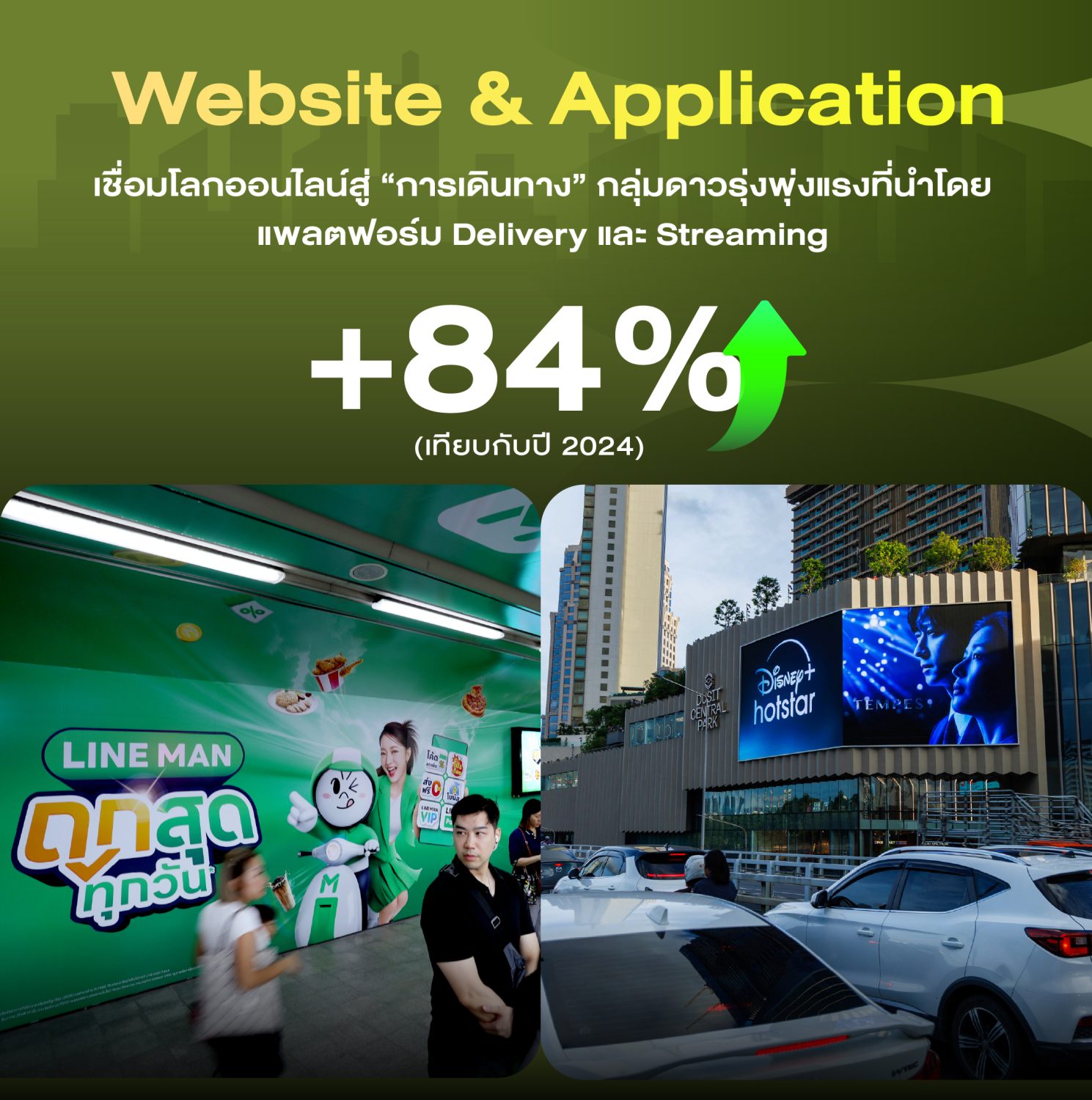 5. Website & Application (เว็บและแอปพลิเคชัน) 🌐➡️🏢 ใช้ Digital OOH เป็นสื่อหลัก โดยงบส่วนใหญ่มาจากแพลตฟอร์ม Delivery และดูหนัง (Streaming)