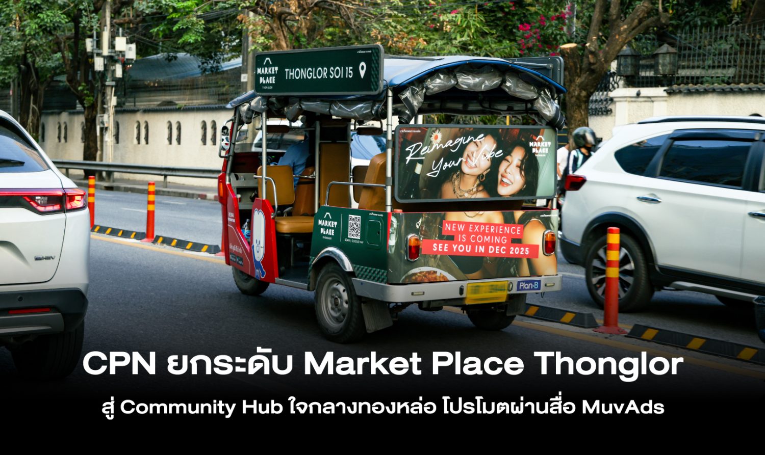 เพื่อเข้าถึงกลุ่มเป้าหมายหลักอย่าง Residents & Workers ในพื้นที่จริง CPN เลือกใช้ สื่อนอกบ้านเคลื่อนที่ที่เข้าใจบริบทของทองหล่อมากที่สุด ผ่านสื่อ MuvAds หรือสื่อบนรถตุ๊กตุ๊กไฟฟ้า Muvmi ให้กลายเป็น Moving Billboard วิ่งรับ-ส่งผู้คนตามซอยย่อยทั่วทองหล่อ เข้าถึงกลุ่มเป้าหมายในระยะประชิดแบบ Hyper-Local ในพื้นที่ที่ป้ายขนาดใหญ่เข้าไม่ถึง