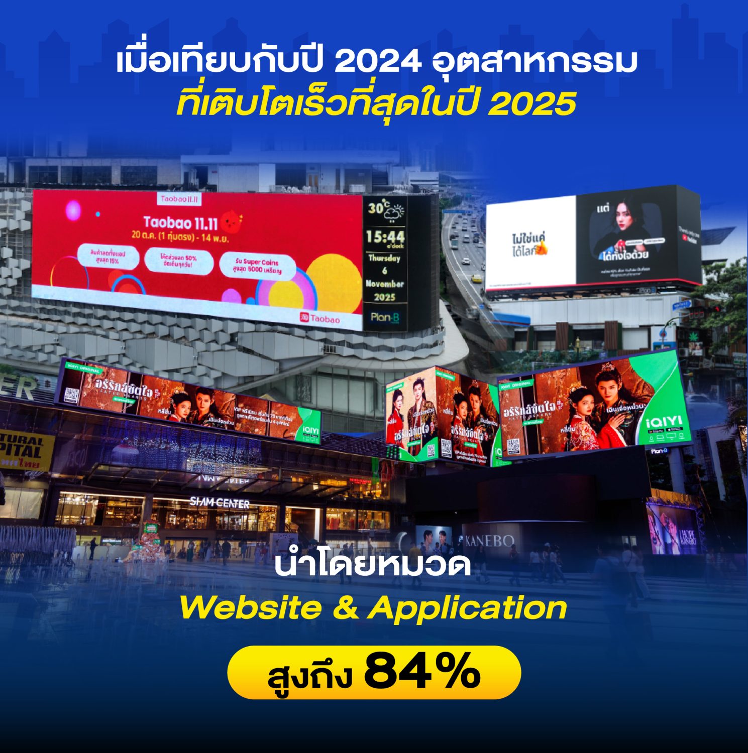 🔥 Spotlight: กลุ่มที่น่าจับตามองที่สุดคือ Website & Application ที่เติบโตพุ่งทยานถึง +84% (เทียบปี 2024) นำโดยแพลตฟอร์มยักษ์ใหญ่อย่าง YouTube, Taobao และ iQIYI สะท้อนให้เห็นเทรนด์ “Online to Offline” ที่ชัดเจน ว่าแม้จะเป็นธุรกิจดิจิทัล แต่การสร้างความเชื่อมั่นและการรับรู้ใน “โลกจริง” ยังคงเป็นกุญแจสำคัญสู่ความสำเร็จที่ยั่งยืน