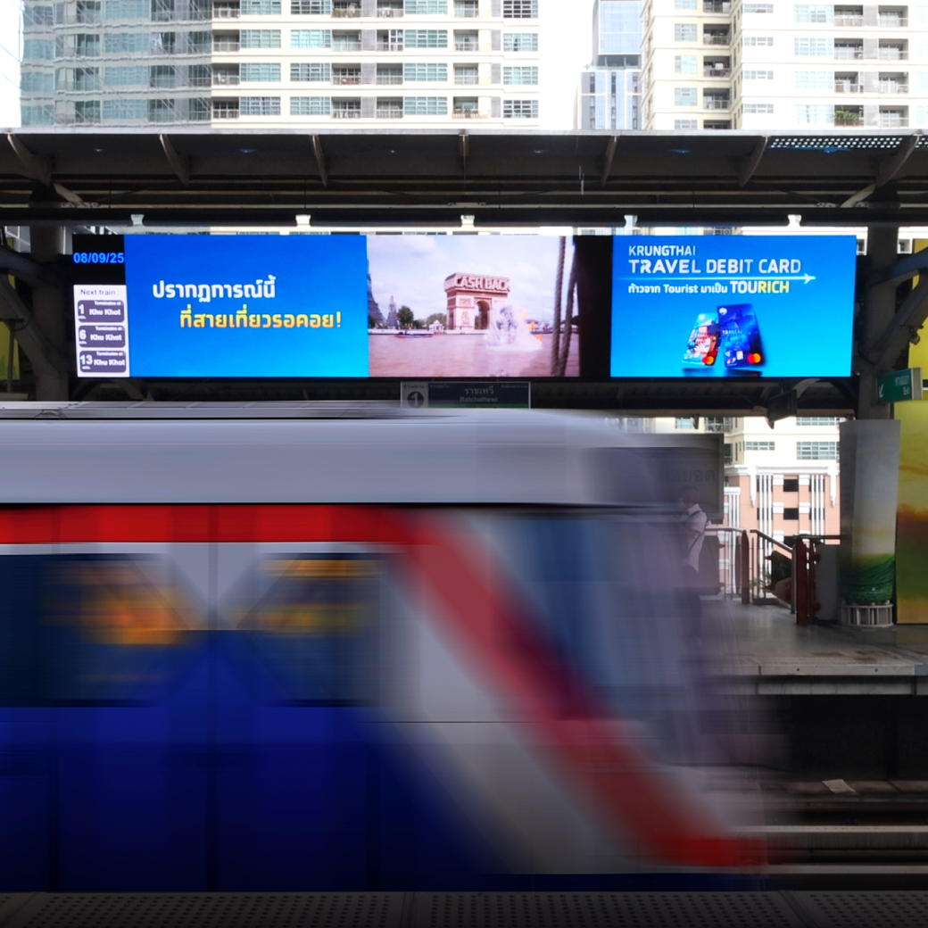 สื่อบนแนวรถไฟฟ้า BTS – เจาะกลุ่มคนรุ่นใหม่ นักศึกษา และคนทำงาน ซึ่งเป็นกลุ่มเป้าหมายหลักที่มีพฤติกรรมการเดินทาง และการใช้จ่ายที่สอดคล้องกับไลฟ์สไตล์ท่องเที่ยว เพิ่มการรับรู้แบรนด์ในช่วงเวลาเดินทางประจำวัน