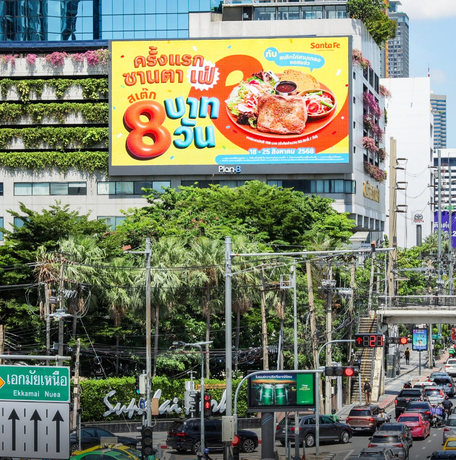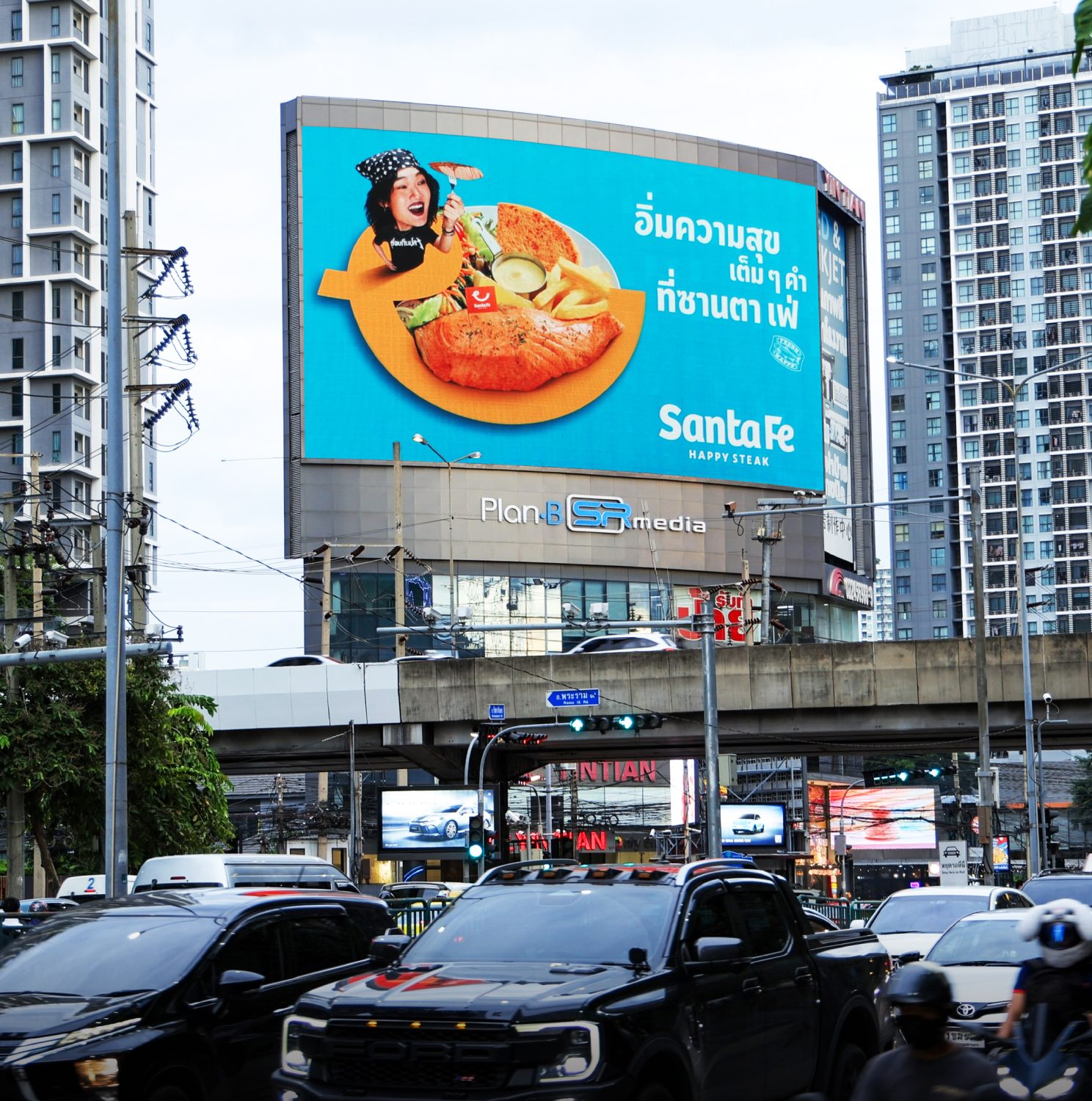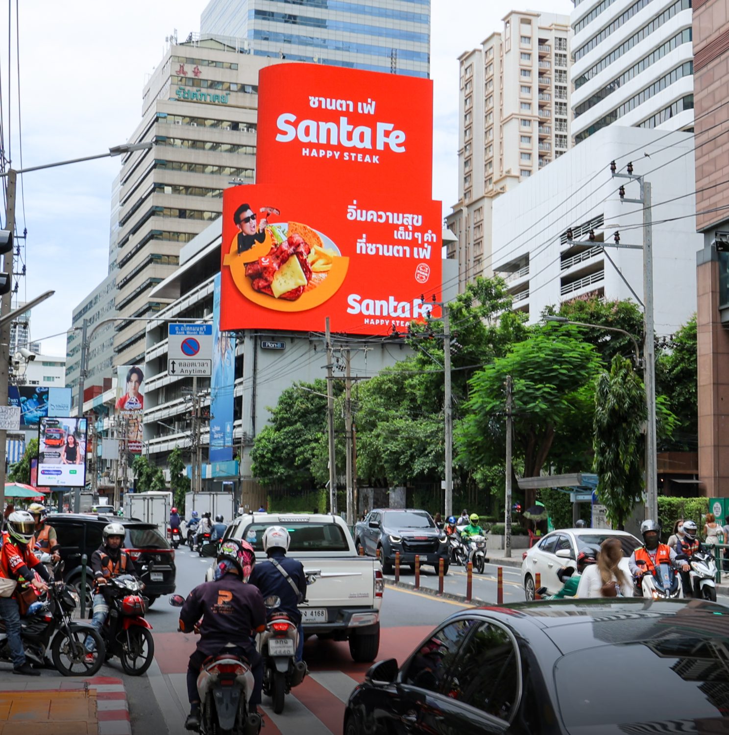 แบรนด์ใช้ สื่อนอกบ้าน (OOH) เป็นเครื่องมือหลักสื่อสารภาพลักษณ์ใหม่ ผ่านจอดิจิทัลทั่วกรุงเทพฯ ที่สร้างการมองเห็นซ้ำทั้งวัน (High Frequency) 👀 เกิดการจดจำแบรนด์ และย้ำ Positioning ว่า Santa Fe คือแบรนด์ที่ สนุก สดใหม่ และกล้าทำอะไรต่างจากเดิม ✨