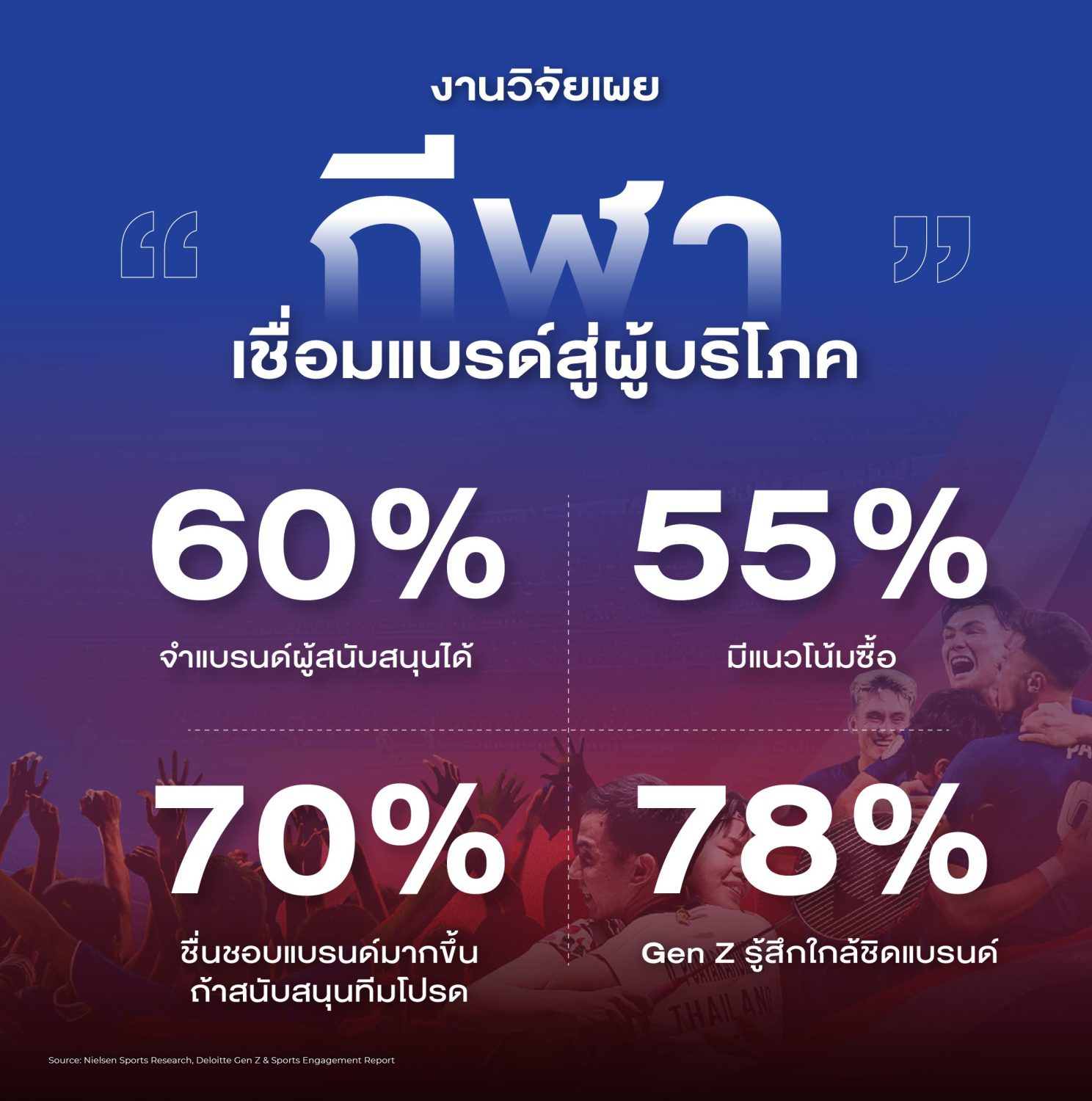 ที่น่าสนใจคือ กีฬาได้กลายเป็นประตูบานสำคัญสู่กลุ่มผู้บริโภคที่เข้าถึงยากที่สุดอย่าง Gen Z โดย Deloitte พบว่า 78% ของ Gen Z รู้สึกใกล้ชิดและมีส่วนร่วมกับแบรนด์ที่ผูกกับกีฬา มากกว่าแบรนด์ที่เน้นขายของเพียงอย่างเดียว